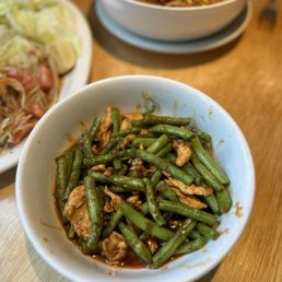 I had the vegetable stir fried, which wasn't really as how it sounds but it was very good! It came with white rice and I also ordered a side of the thai gyoza. Very delicious and flavorful food!
